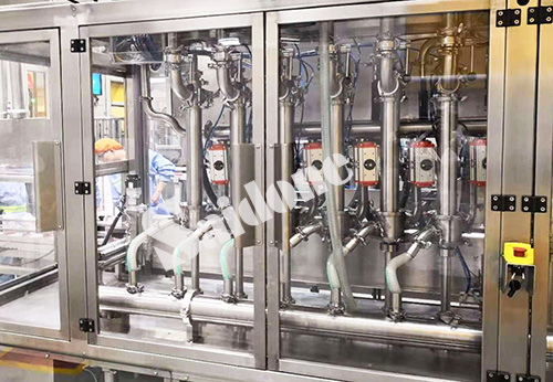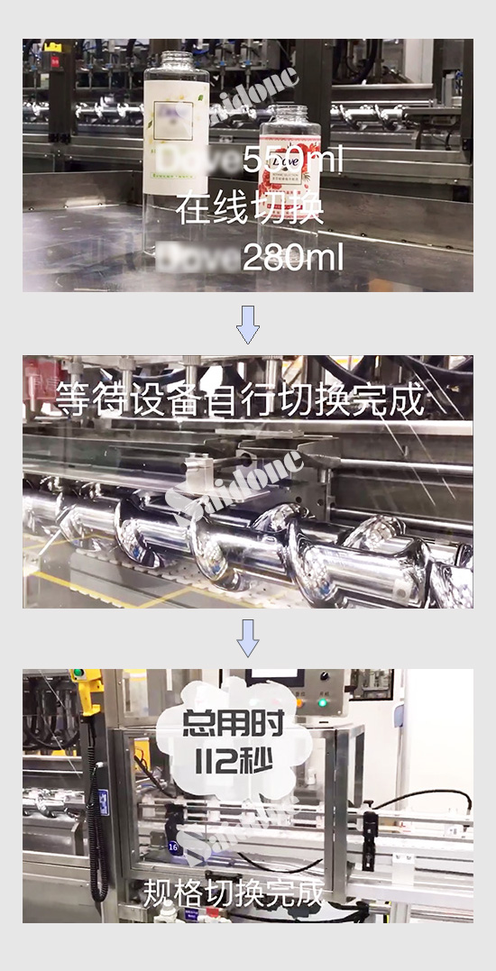 “哄~~~~~哄~~~~~~~~~”***華的沐浴露灌裝車間里,幾聲輕巧的按鈕聲后,伴隨著低聲的隆隆聲,剛才還在高速生產(chǎn)狀態(tài)的全自動灌裝機停止了灌裝。隨即螺桿、灌裝頭、護欄開始調(diào)整就位,過程平穩(wěn)流暢。112秒!隨著調(diào)整到位,生產(chǎn)開始按鈕按下,新的灌裝指令發(fā)出,灌裝機立即進入下一個規(guī)格產(chǎn)品的高速灌裝。從550ml到280ml更換規(guī)格灌裝,全部調(diào)整完成不足2分鐘,產(chǎn)品規(guī)格的更換幾乎無縫銜接。這,是否是你向往已久的灌裝生產(chǎn)模式?